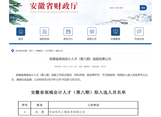 12月18日,安徽省財政廳公布“安徽省高端會計人才”(第八期)錄取人員名單,經(jīng)過材料評審、現(xiàn)場筆試、專家面試等多輪考核,中冶華天財務(wù)管理部員工段震從眾多候選人中脫穎而出、成功入選,有力展現(xiàn)了華天財務(wù)人員的綜合實(shí)力與向上風(fēng)采!